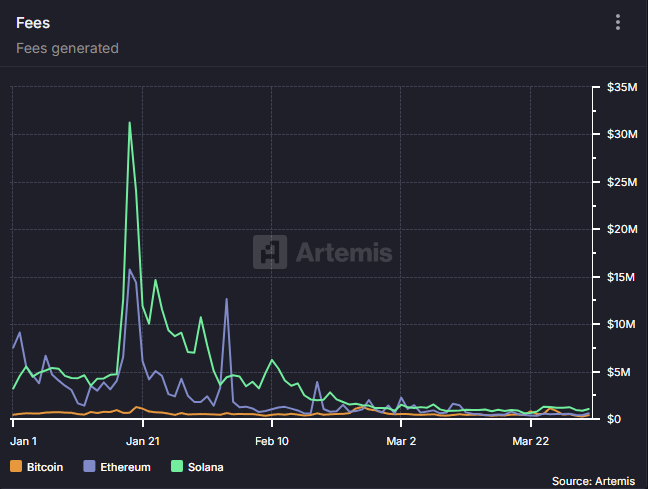 Despite rapid growth, Bitcoin’s DeFi footprint remains tiny compared to Ethereum and other chains – underscoring the room for expansion. Ethereum still dominates DeFi with around $130–$175 billion TVL at its 2021 peak (about $130B as of late 2024). In contrast, Bitcoin-focused DeFi protocols hold on the order of $5–6 billion total. That is only ~4% of Ethereum’s DeFi capital. Even Tron, BSC, and other smart contract networks each host several billions in DeFi. Bitcoin’s native DeFi liquidity is only now breaking the ~$1 billion mark on-chain (spread across sidechains and channels), with the rest coming from cross-chain implementations. This disparity exists because Bitcoin’s network lacked built-in DeFi until recently, whereas Ethereum was designed for it. The Bitcoin community’s conservative approach has historically focused on stability over rapid innovation. As a result, Bitcoin’s on-chain activity, DeFi apps, and fee volumes have trailed far behind newer layer-1s. The chart below (from Artemis data) illustrates Bitcoin’s low on-chain fees and DeFi TVL relative to other chains. However, this dynamic is starting to change.