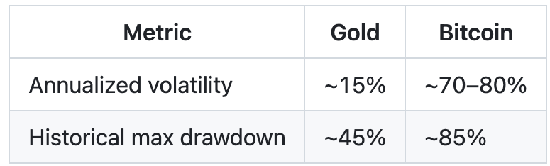 Drawdowns of 70–80% are structural. They happen because Bitcoin is still discovering what it is worth when stress hits. Gold investors love to point this out, usually without mentioning that they tolerated twenty years of real losses without calling it a failure.