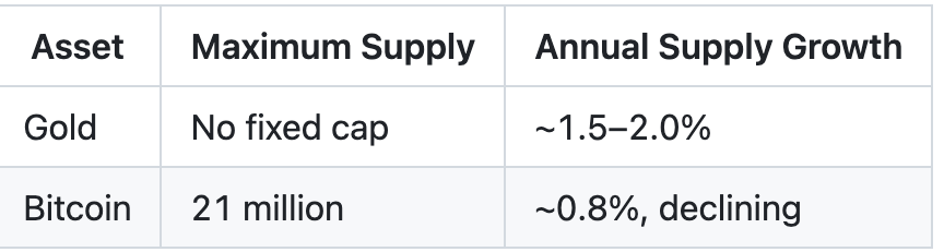 Gold’s scarcity is geological. Bitcoin’s scarcity is algorithmic. Both sit outside committees, elections, and emergency meetings.
